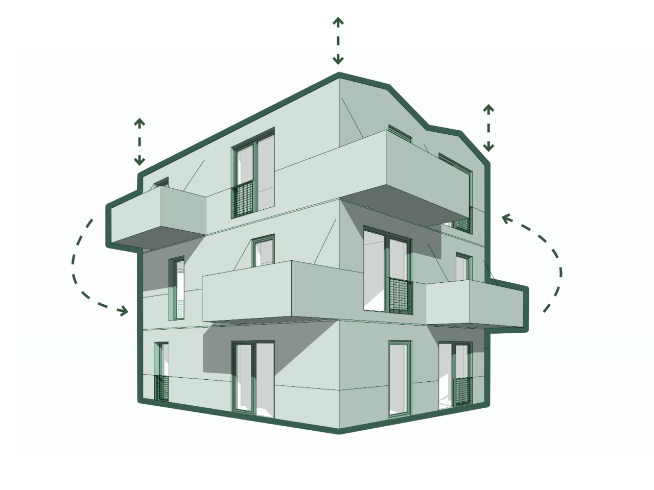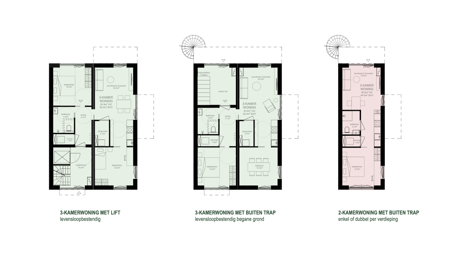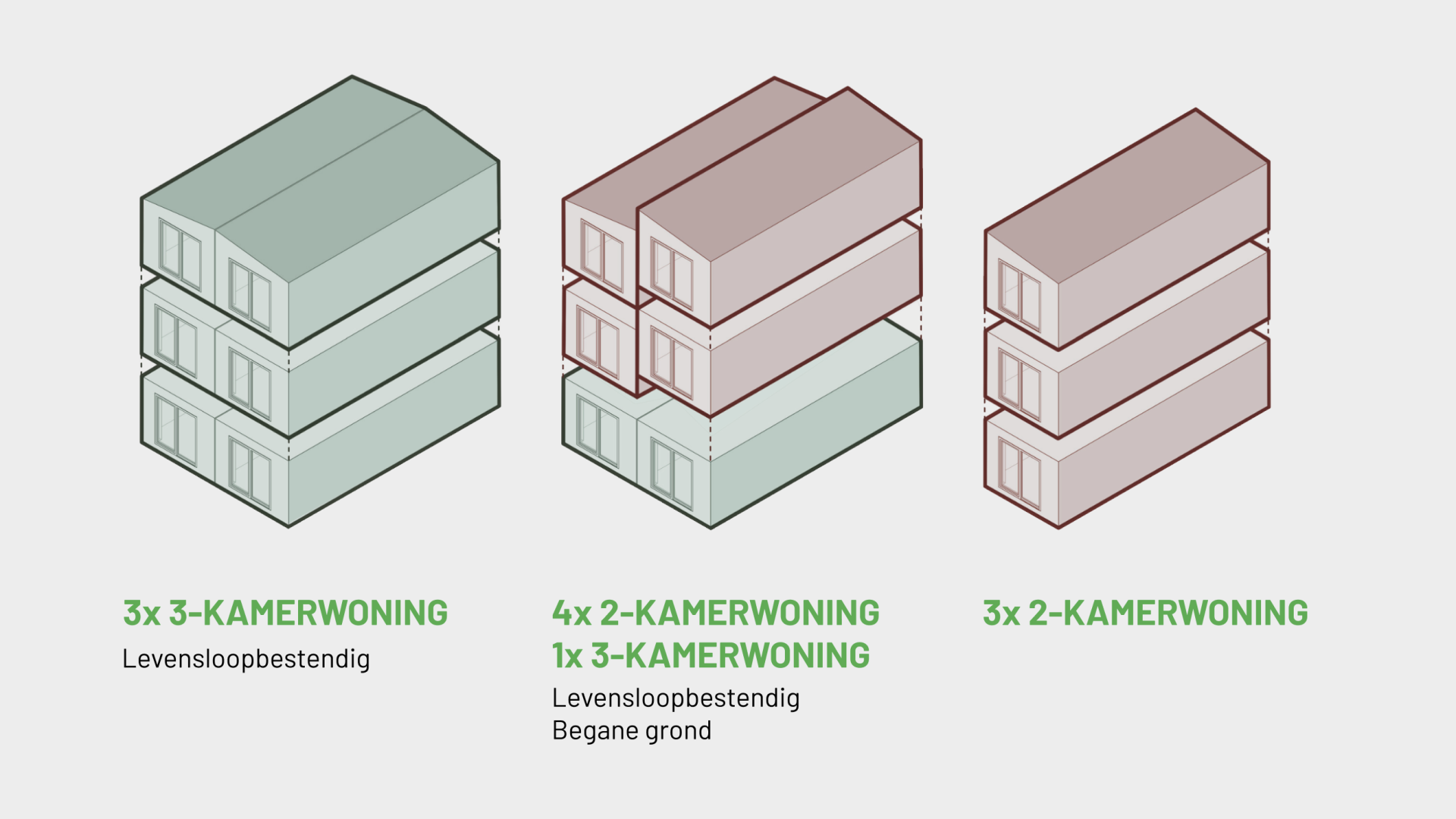 We combineren studio’s en driekamer-woningen in één gebouw, afhankelijk van wat jouw wijk nodig heeft. Smal perceel? Brede kavel? We variëren in breedte en stapelen waar het kan.