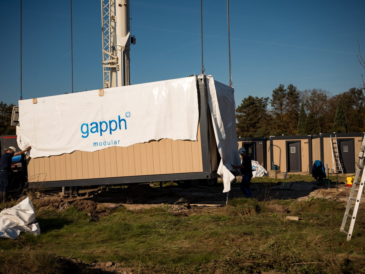 De eerste modules van in totaal 81 flexwoningen aan de Ruimtebaan zijn geplaatst.